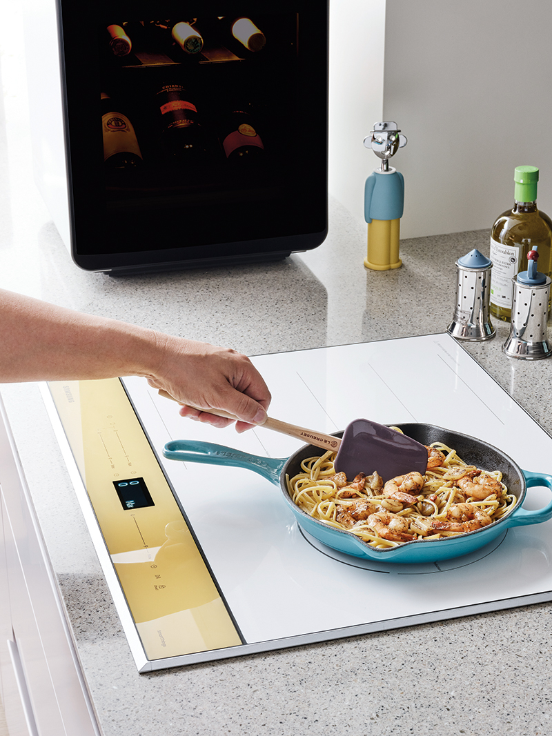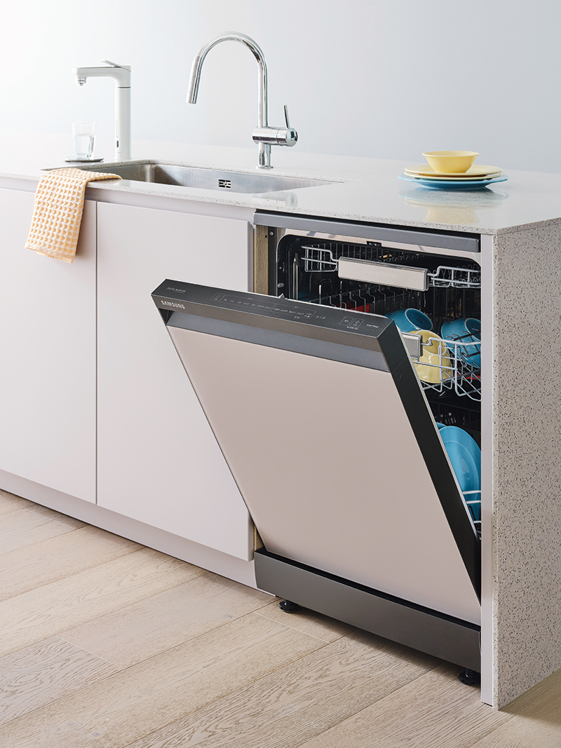 - 요리를마음껏즐기는이유 중 하나도 든든한 비스포크 식기세척기가 있기 때문. 손으로 애벌세척을 할 필요가 없는 강력한 세척력은 물론 고온의 직수로 살균해 청결과 위생도 문제없다.