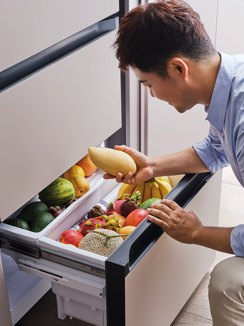 - 열대과일이나 뿌리채소 등 보관이 까다로운 식재료도 비스포크 김치플러스의 감자/바나나 모드로 오랫동안 신선하게 보관할 수 있어 바쁜 그에게는 안성맞춤 제품이다.