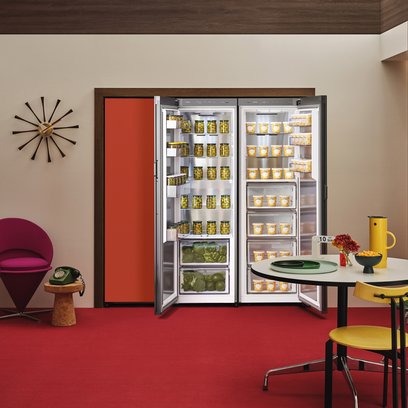 흑백 일색이었던 냉장고에 컬러를 입힌 비스포크 냉장고. 이제 명도, 채도, 온도 등 섬세한 차이까지 구현한 360가지 컬러로 보다 디테일한 취향에 맞춰준다. 옛 할리우드 영화나 포스터에서 자주 볼 법한 아메리칸 미드센트리 레트로 스타일에는 채도가 낮은 그린, 레드, 옐로우 조합의 비스포크 냉장고로 레트로한 분위기를 더했다. 과감한 색상의 가구를 무심하게 툭툭 놓고, 패브릭과 우드 마감재를 활용했다. 비스포크 냉장고 1도어는 각 제품 선반 높낮이를 맞춰 깔끔해진 내부 디자인으로 내부의 심미성까지 놓치지 않는다. 냉장, 냉동, 김치 3개의 냉장고를 열면 마치 하나의 냉장고를 쓰는 듯한 기분을 느낄 수 있다.